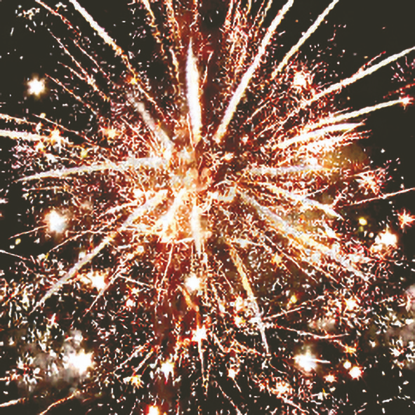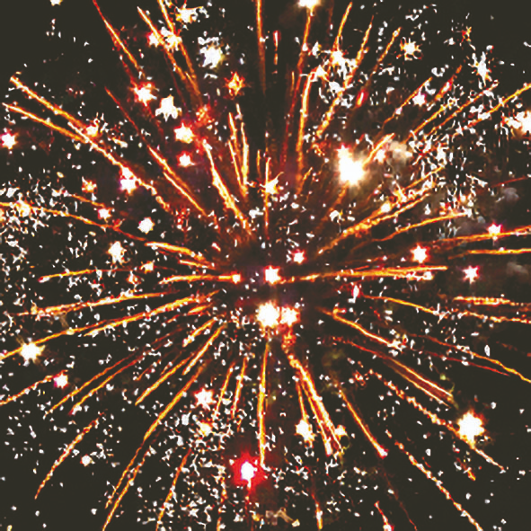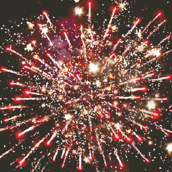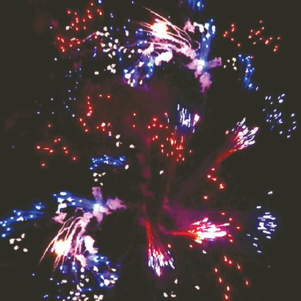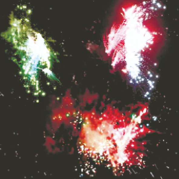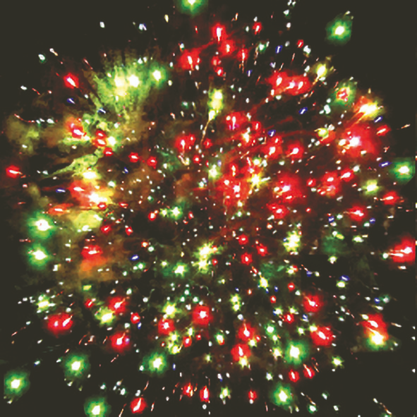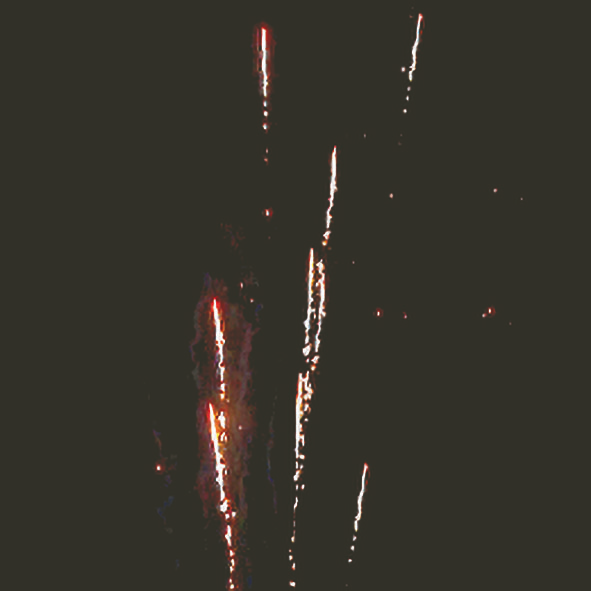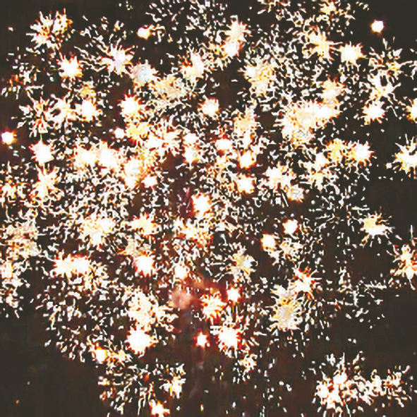 треск. Множество серебряных ниспадающих нитей (парча) и белое мерцание. Сине-красная сфера (пион) и треск. Множество серебряных ниспадающих нитей (парча) и зеленое мерцание. Зелено-фиолетово-красная мерцающая сфера (пион). Множество золотых ниспадающих нитей (парча) и зеленое мерцание. Оранжево-зеленая сфера (пион) и треск. Зеленые звезды с пышными хвостами (кокос) и треск. Красно-зелено-золотая мерцающая сфера (пион).