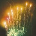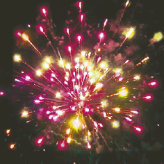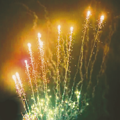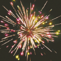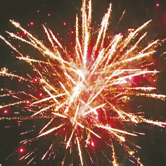 1-2. Выстреливает подряд: Множество серебряных ниспадающих нитей (парча) и фиолетово-желтые звезды. Красно-зеленые звезды с пышными хвостами (кокос) и треск.