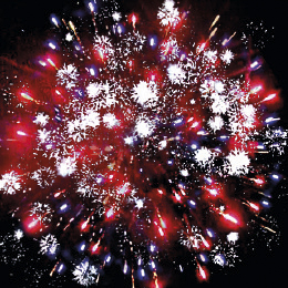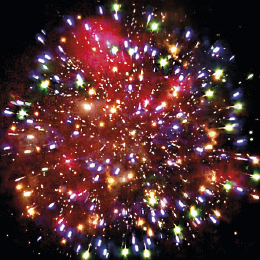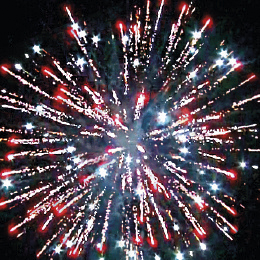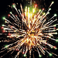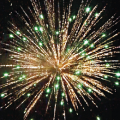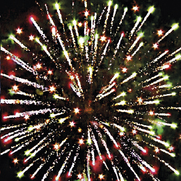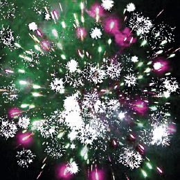 8. Финальный залп: Зелено-красные звезды с пышными хвостами (кокос) и облако треска (трещащая хризантема).
