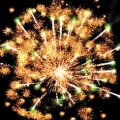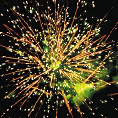 Зеленые звезды с пышными хвостами (кокос) и облако золотых трещащих разрывов (трещащий дождь).