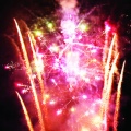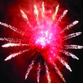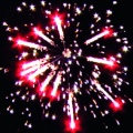 Мерцающая комета разрывается красно-белой мерцающей сферой (пион).